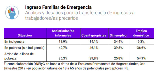 Esta semana, se afirmó que todas las personas que percibieron el IFE son “más de 11 millones de trabajadores y trabajadoras por fuera de la relación de dependencia”. Esta fría y terrible estadística es inexacta de a millones. De casi 8,9 M que percibieron el IFE 1, el 61,7 por ciento estuvo compuesto por 5,6 M de personas en relación de dependencia no registradas, informales o desocupadas; y por 0,18 M de trabajadoras y trabajadores de casas particulares. Además, un 9,3 por ciento del total estuvo compuesto por 0,8 M de personas que tuvieron ingresos por trabajos en relación de dependencia y registrados antes de la pandemia. Así lo resume ANSES.