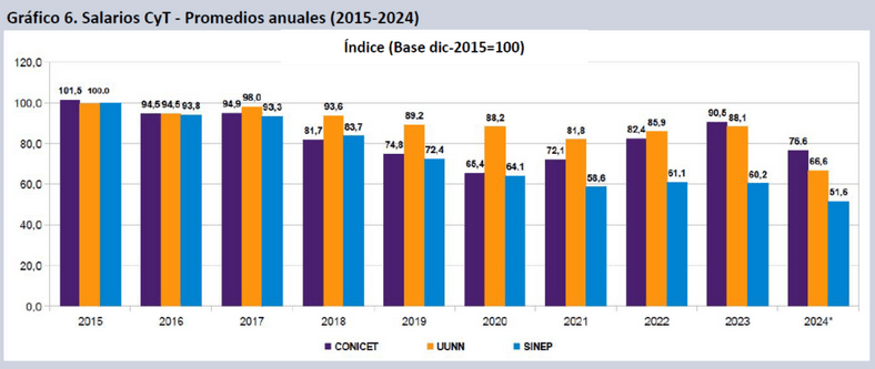 A modo de ejemplo, puede verse en el gráfico la evolución de los ingresos enfocados en CyT tanto en Universidades Nacionales (UUNN) como en las instituciones regidas por el Sistema Nacional de Empleo Público (SINEP) y el CONICET (Carrera de Investigador, CIC, y Carrera de Personal de Apoyo, CPA). Se observa una caída persistente de los salarios en promedios anuales (tomando 2015 como año de base) del 33,4% en UUNN, 48,4% en SINEP, y 23,4% en CONICET. Este informe explica: “Los salarios de los empleados públicos perdieron la mitad de su poder adquisitivo en nueve años, los universitarios un tercio y los empleados del CONICET casi un cuarto”.