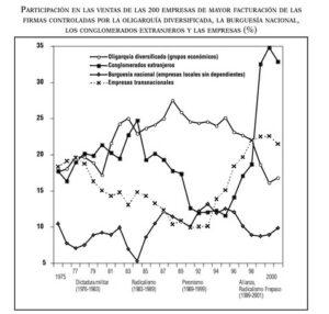 Idéntica falsificación ocurre cuando se alude a la Argentina como un país lleno de “riquezas”, que nos imposta como herederos de una inagotable fortuna geográfica, lo que se contrasta con la concentración de los recursos naturales y de la energía bajo explotación extranjera. Dice Ignacio Lewkowicz: "El mito del país rico se monta sobre el equívoco de la definición territorial del país. El mito del país rico se cuestiona con la evidencia de un país literalmente desfondado" (2002: 198) [3]. La ola de privatizaciones de empresas estatales de mediados de los ‘90 incrementó de manera abrupta la participación del capital extranjero en las ventas de las firmas de mayor facturación, superando las de los grupos económicos locales y reestructurando el bloque social dominante. “Esta nueva fase de extranjerización de la economía local presentó características inéditas en términos históricos, porque no se trataba de la venta de empresas que registraban una situación económica-financiera comprometida, sino de las que eran líderes en sus respectivas actividades o, incluso, las de mayor rentabilidad en la economía real como era el caso de las empresas de servicios públicos” (2006: 145) [4], declara Eduardo Basualdo y lo exhibe en el siguiente gráfico: