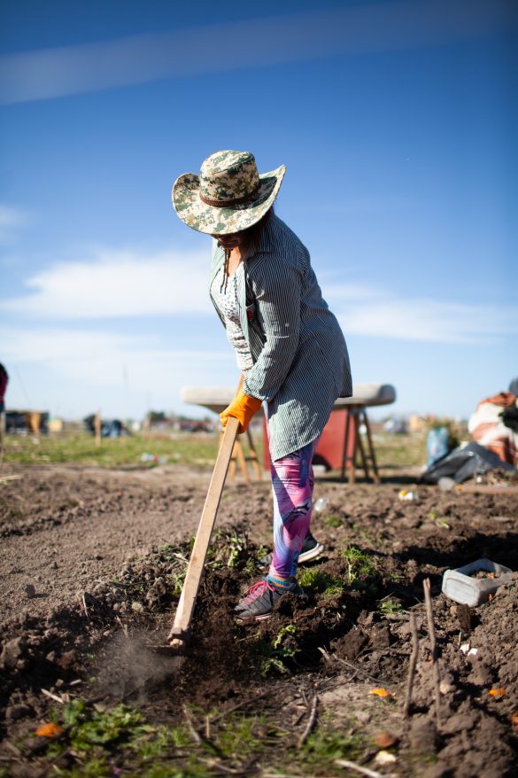 “Necesitamos una tierra para vivir. Yo estaba alquilando y con la pandemia, sin poder trabajar, me fui a lo de mi hermana y después ella ya no podía bancar el alquiler. Todo un lío. Pero acá estoy tranquila y acá estaremos”, dice Alejandra Martínez, mientras ayuda a su vecina de casilla a trabajar la tierra. Armaron una pequeña huerta de la que están brotando pequeñas cebollitas. Tiene 25 años y es peluquera. No quiere que le saquen fotos sin su barbijo. Como en su manzana no hay electricidad, no tiene los elementos para cortarle el pelo a los varones que son quienes más se acercan a pedirle. En la manzana donde vive Alejandra son todas niñas, adolescentes, mujeres y personas trans. Improvisaron una cancha de voley para pasar las tardes.