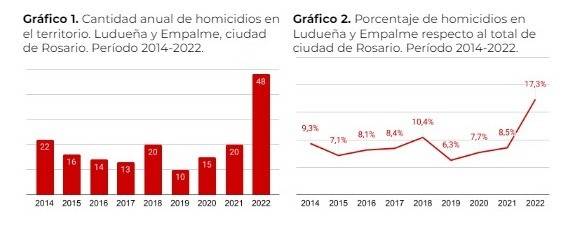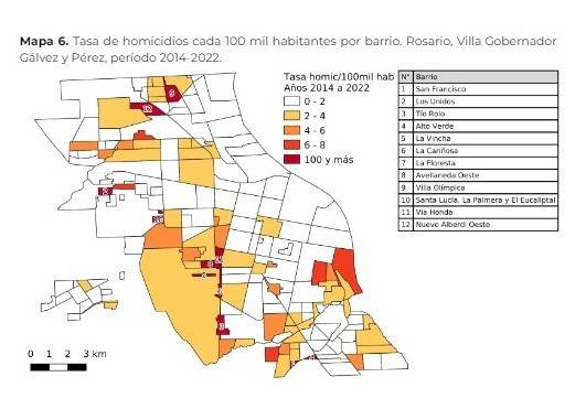 Si comparamos esos conglomerados con los homicidios dolosos registrados en las ciudades de Rosario, La Matanza y Buenos Aires durante 2022 observamos que en la primera (según datos del Ministerio Público de la Acusación) se cometieron 287 homicidios dolosos, esto es 22,1 muertes cada 100.000 habitantes, lo cual representa no solo la tasa más alta del país sino la más alta de esa ciudad desde el comienzo de la serie estadística en 2014. La Matanza, que es el partido con mayor población del Conurbano bonaerense y donde más homicidios se cometieron, la cifra es de 124, lo que representa una tasa de 6,75 cada 100.000 habitantes (datos del Ministerio Público de la Provincia de Buenos Aires). Finalmente, en la ciudad de Buenos Aires ese mismo año se produjeron 88 asesinatos, lo que implica una de las tasas más bajas de la región: 2,86 cada 100.000 habitantes.