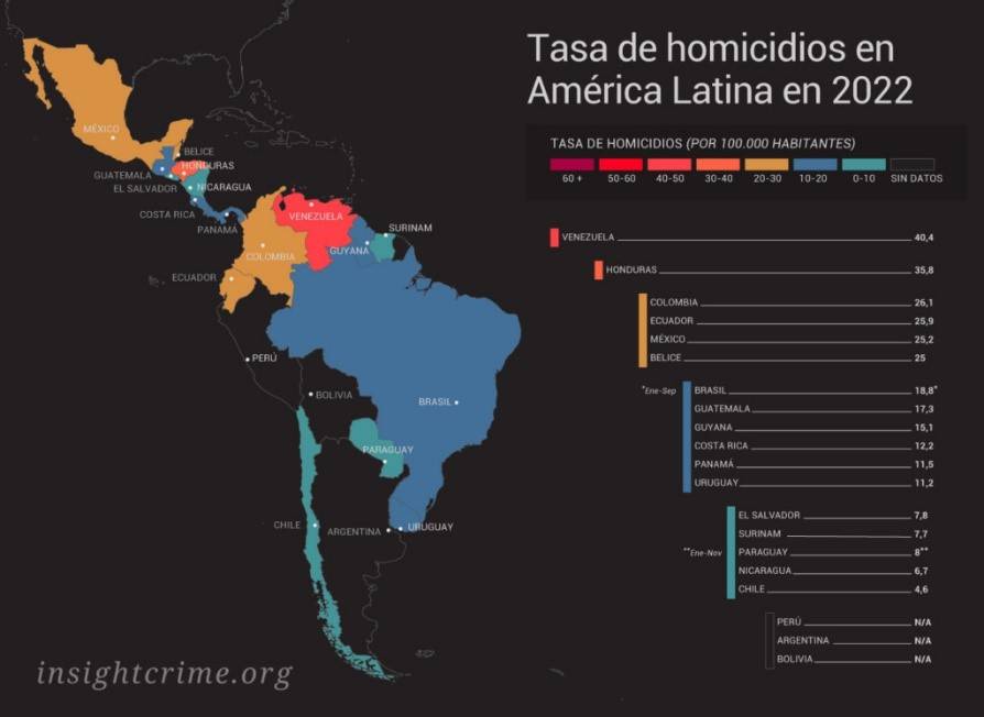 En Venezuela, durante el 2022 (según datos del Observatorio Venezolano de Violencia) hubo un total de 9.367 muertes violentas, es decir, un promedio de 26 por día. Venezuela tiene la tasa más alta de estos delitos de toda América del Sur y el Caribe: 40,4 por cada 100.000 habitantes (con una población de 28.199.867). Si las desapariciones no se incluyen en este cálculo, la tasa general se reduce a 35,3. En Colombia (según datos de la Policía Nacional), ese mismo año se registraron un total de 13.442 homicidios, esto es 26,8 homicidios por cada 100.000 habitantes (población: 51.516.562). Por su parte, en Brasil se registraron 40.800 asesinatos (según el Índice Nacional de Homicidios elaborado por el grupo de medios Globo), lo que representa una tasa de 19 por cada 100.000 (población: 214.326.223). En cuanto a la Argentina, que suele ser muy perezosa a la hora de producir información y más opaca aún a la hora de hacerla pública, registró 2.092 homicidios en 2021 (según datos del Ministerio de Seguridad de la Nación), una cifra que representa una de las tasas más bajas de la región: 4,6 por cada 100.000 habitantes (población: 45.908.747).