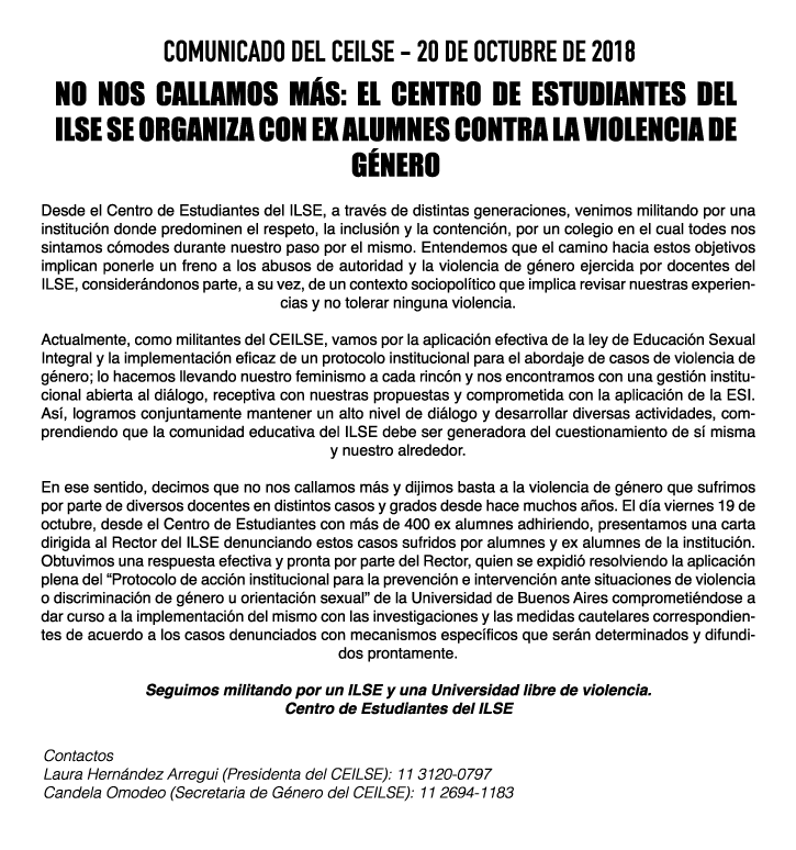 La calle Libertad al 555 alberga al Instituto Libre de Segunda Enseñanza (ILSE), colegio preuniversitario fundado en el año 1892. En su fachada sujeta el lema consagra la vida a la verdad, traducción del antiguo letrero vitam impendere vero. El secundario que depende de la Universidad de Buenos Aires fue creado por hombres y para hombres. Hacia 1982, noventa años después de su creación, la institución por primera vez permitió el ingreso de mujeres, que con el paso de los años se volvieron protagonistas en las aulas y en el Centro de Estudiantes. El pasado viernes, el Centro presentó a las autoridades una denuncia por casos de abuso de autoridad, violencia institucional, de género y patriarcal, ejercidas por docentes y avaladas por la institución durante al menos, las últimas dos décadas. El documento histórico cuenta con más de cuatrocientas adhesiones de ex alumnos y alumnas.