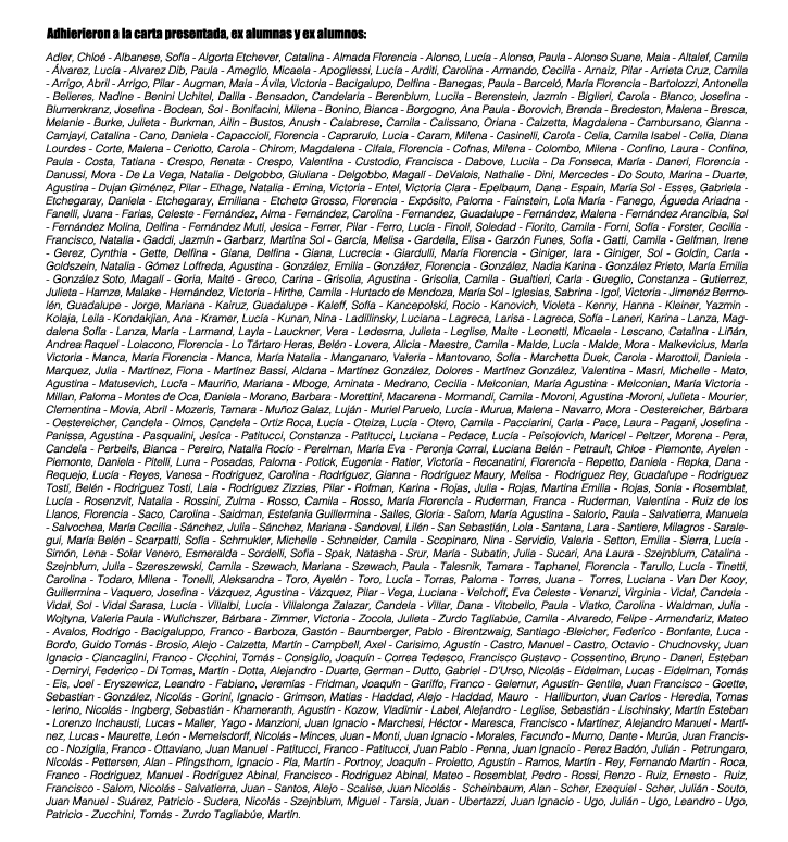 “Nos animamos a hablar porque sabemos que fueron excesivos los casos y no puede haber más. Nos animamos a hablar por las generaciones graduadas que no pudieron. Y no nos referiremos a situaciones de profesores que ya no dictan clases en el colegio”, manifestaron las alumnas. El Centro de Estudiantes insiste en que el objetivo traspasa la denuncia en sí misma, pero ante la falta de medidas efectivas y respuestas se ven obligadas a hacer pública la situación. Los colegios resultan grandes encubridores de violencia, pero las pibas ya no se callan. La visibilización de los abusos, las incomodidades y los testimonios rompe el esquema de la élite intelectual, conservadora y machista que este tipo de colegios fomentan omitiendo las violencias escolares diarias. Quienes estudian en secundarios preuniversitarios, conocen sus privilegios y desde ese lugar alzan sus voces en la esfera pública y denuncian los acosos sistémicos, sistemáticos y permanentes que sufren sobre sus propios cuerpos pero que también suceden en la mayoría de los colegios que no tienen ni las cámaras, ni la prensa, ni la repercusión que genera un caso en un secundario dependiente de la Universidad de Buenos Aires. Ese es el motivo que perfora en sí la demanda concreta. El tejido de las propias narrativas de mujeres de catorce, quince, dieciséis, diecisiete años que sufren hechos de violencia en sus propios lugares de aprendizaje y formación, es una forma de comenzar a frenar el abuso de poder hegemónico, violento y cosificante del que hacen uso los docentes denunciados.