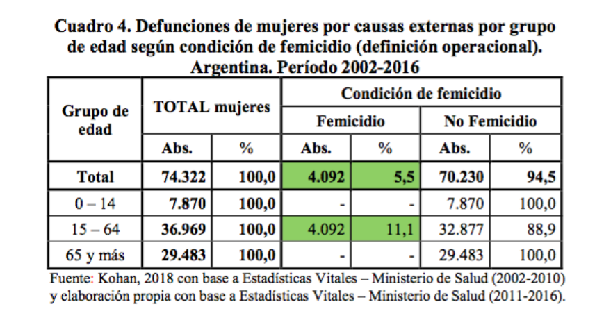 Según la investigación de Kohan basada en las estadísticas vitales, en el período 2002-2016, de las 74.322 mujeres que murieron por causas externas entre 2002 y 2016 en la Argentina, 4.092 fueron categorizadas como femicidios. Un promedio de 272 femicidios por año. Un femicidio cada 32 horas.