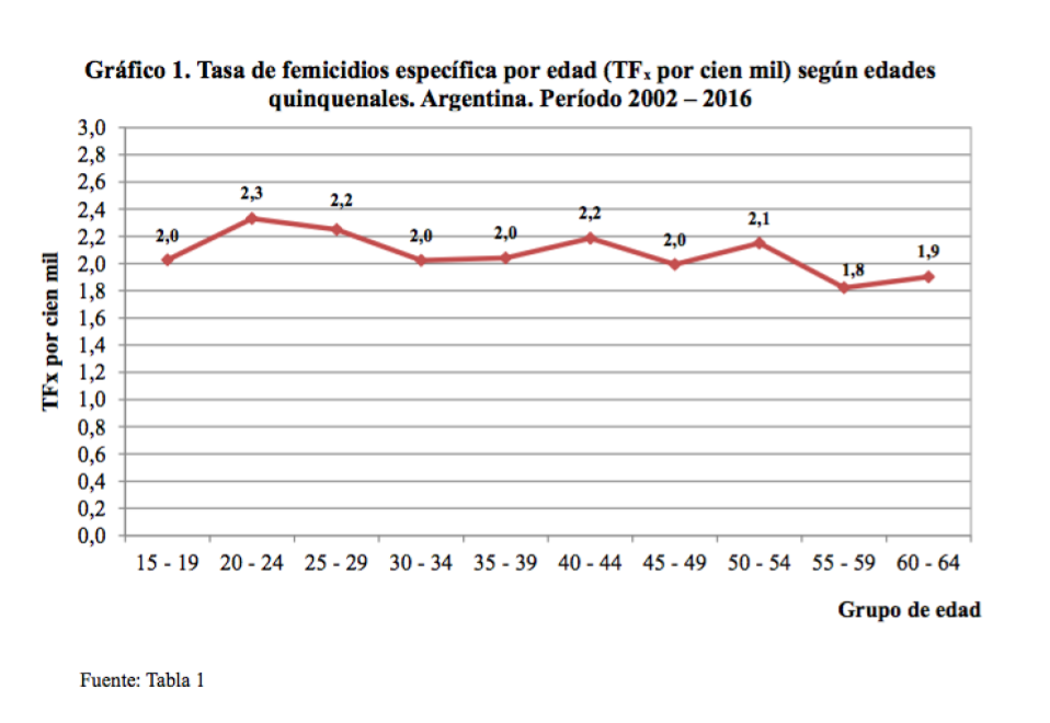 “Una primera lectura de las frecuencias y distribución según edad podría hacernos suponer que son las mujeres más jóvenes las más afectadas por esta problemática”, aclara Jimena. “Sin embargo se verifican muy leves diferencias entre los grupos etarios”. La menor tasa es de 1,8 en el intervalo 55-59 años y las mayores tasas son de 2,3 femicidios por cada 100.000 mujeres entre los 20 y 24 años.