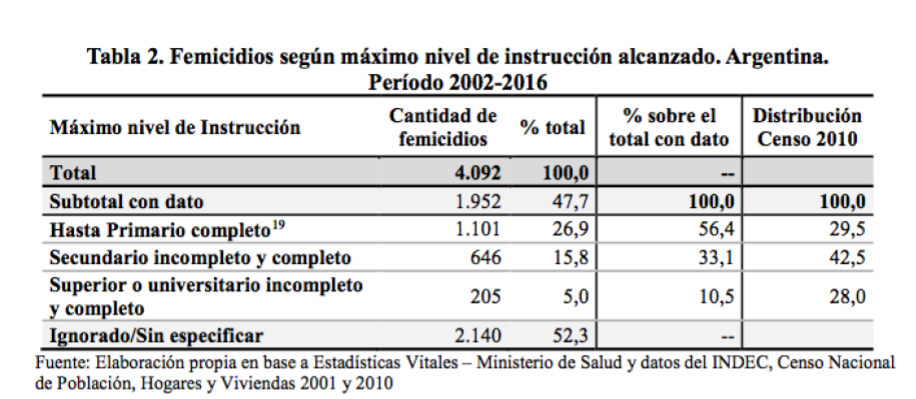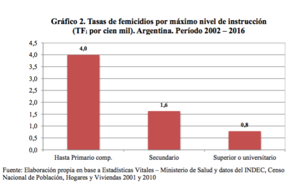 Las/os expertas/os en violencia de género señalan que la violencia femicida ocurre cualquiera sea el nivel educativo o la condición de clase. Sin embargo, según este estudio los grupos de mujeres con menor nivel educativo estarían más afectados que los de mujeres con mayor nivel de instrucción.