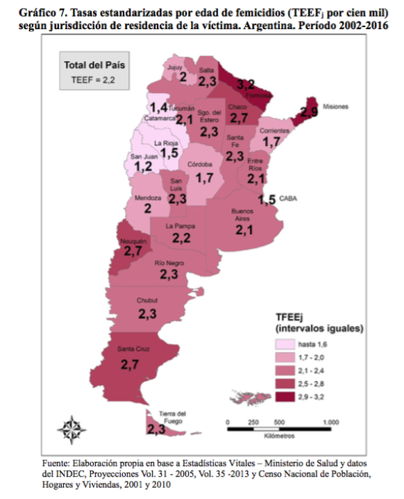 Este hallazgo contradice la suposición de que es en las provincias del norte, usualmente relacionadas por el sentido común a prácticas más conservadoras y por tanto más machistas que el resto del país, donde los índices de femicidios serían más altos. Por el contrario, provincias “jóvenes” y “ricas” como Neuquén o Santa Cruz tienen valores similares a Chaco, Formosa y Misiones.