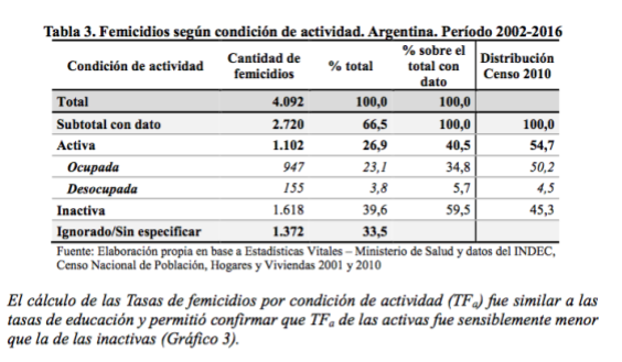 En la distribución de los casos con respuesta, el 42% se ubica en la categoría de activas, la cual contiene a las mujeres que trabajaban o estaban de licencia o no trabajaban y buscaban trabajo. Kohan cruzó esta información con los Censos 2001 y 2010. Según el Censo 2001 el 55% de las mujeres de 14 años y más eran inactivas; mientras que en el Censo 2010 el 45%. En la población expuesta en promedio, el 50% estaban inactivas, mientras que en la medición de femicidios la proporción de inactivas es del 58%, es decir, que están sobrerrepresentadas.