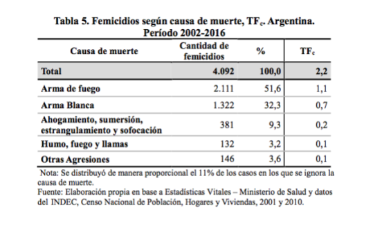 Según esta investigación, en el 52% de los femicidios la causa de muerte fue con un arma de fuego. En la Argentina, al igual que en la mayoría de los países del mundo, las mujeres no son las usuarias ni compradoras de las armas de fuego: el 97 por ciento de los pedidos ante el Registro Nacional de Armas (RENAR) para convertirse en legítimos usuarios son hombres. Según el Registro de Femicidios y Homicidios Agravados por el Género de la Secretaría de Derechos Humanos de la Nación, casi una de cada cuatro víctimas fueron asesinadas a balazos. En coincidencia, según el Observatorio de femicidios “Adriana Marisel Zambrano”, de la Casa del Encuentro, en el período 2008-2017, 1 de cada 4 femicidios fueron cometidos con arma de fuego. El estudio de Jimena Kohan duplica el número: en el 52% de los casos fue con arma de fuego, en el 32% con arma blanca y en el 9% por ahogamiento, sumersión, estrangulamiento y sofocación (Tabla 5).
