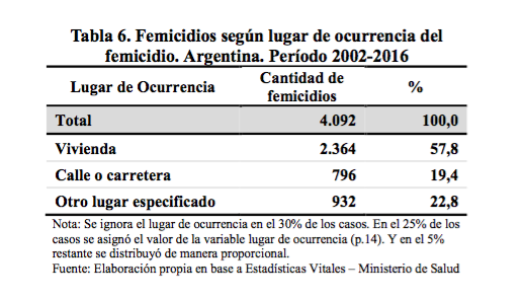 Lejos de la asociación entre femicidios y seguridad pública, que redunda en el pedido de más policías para frenar la inseguridad de las mujeres, la investigación de Kohan confirma que el 57,8% de los femicidios se da en el ámbito privado, específicamente en viviendas particulares. El observatorio de la Casa del Encuentro también arroja un dato similar: en más del 51% las víctimas encuentran la muerte en sus hogares, pero si tomamos todos los femicidios perpetrados en cualquier vivienda (sea o no la casa de la víctima), ese número alcanza el 62,6 %.