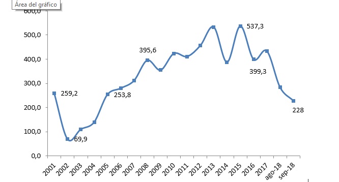 Por otro lado, los costos sociales de las medidas de los últimos 4 meses –que se acumulan con retrocesos consolidados desde 2016— hacen difícil pensar en la sustentabilidad de nuevos recortes de partidas sociales. La mega devaluación generó una brutal caída del salario medido en dólares. Si calculamos el salario mínimo vital y móvil en dólares (deflactado por la inflación de Estados Unidos), vemos que en 2001 el salario mínimo estaba en 259 dólares, cae a 69,9 dólares con la devaluación post salida de la convertibilidad, y se empieza a recuperar a partir de ahí, llegando en el año 2006 a 280 dólares y superando el bajo valor de 2001. En 2015 llega a 537 dólares, y la caída de 2016 es notable, a 399 dólares. Nuevamente en 2018 una caída a 228 dólares en septiembre, ubicándose por debajo del nivel de 2001. Solamente entre marzo y junio de este año la cantidad de trabajadores expulsados (registrados y en el sector privado, tomando como fuente SIPA del Ministerio de Trabajo) asciende a 96.138. No es descabellado prever una duplicación de estas expulsiones no ya con 1 trimestre de caída (abril, mayo y junio) sino con 3 trimestres consecutivos, hasta diciembre de 2018. En efecto, el borrador del Ministerio de Hacienda que Nicolás Dujovne no oficializó, pero tampoco negó, establece una caída del producto de 2,4%, bien lejos de lo pactado en junio con el FMI (entre 0,4% y 1,4%) y lejísimo del iluso 3,5% previsto en el Presupuesto 2018.