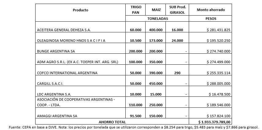 Esta condescendencia fue aún más explícita el viernes 31 de agosto, cuando ante la inminente fijación de retenciones, desde el Ministerio de Agroindustria se mantuvo abierta la posibilidad de registrar declaraciones juradas de ventas al exterior (DJVE), posibilitando la evasión de retenciones a los principales grupos económicos cerealero-oleaginosos de la Argentina. En efecto, si hacemos la estimación de la evasión, solo 9 empresas se beneficiaron en 1.933 millones de pesos al inscribir sus exportaciones previamente a la reposición de derechos de exportación. Los nombres de los grupos que accedieron a información privilegiada son Aceitera General Deheza, Oleaginosa Moreno, Bunge Argentina, ADM Agro (ex Toeper), Cofco International Argentina, Cargill, L. Dreyfus, Asociación de Cooperativas Argentinas y Amaggi Argentina. En el cuadro 2 que se consigna a continuación es posible observar el detalle de toneladas declaradas y montos de retenciones ahorrados por empresa.