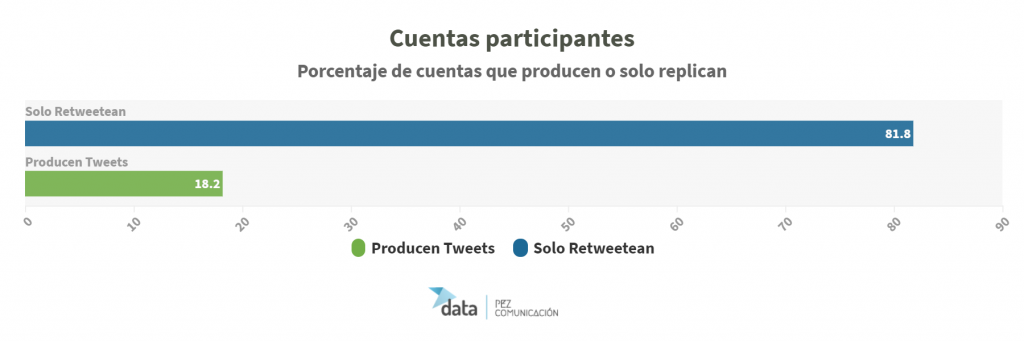Como resultado de esta tarea obtuvimos un total de 110.446 tweets, de los cuales 17.941 son tweets originales, y el resto retweets. Participaron 98.451 usuarios, de los cuales sólo produjeron tweets originales 9.852. Esto último es algo corriente en redes con el nivel de concentración y jerarquización de Twitter.