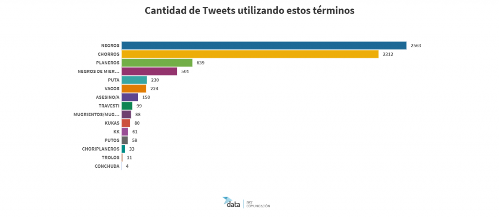En el gráfico vemos la cantidad de tweets en los que aparecen cada uno de los términos más utilizados. Allí destaca el uso de “negros”, “chorros” y “planeros” para referirse a los seguidores del gobierno de Alberto Fernández. El 36% de los tweets que relevamos utilizó “negros”, el 32% “chorros” y el 9% “planeros”.