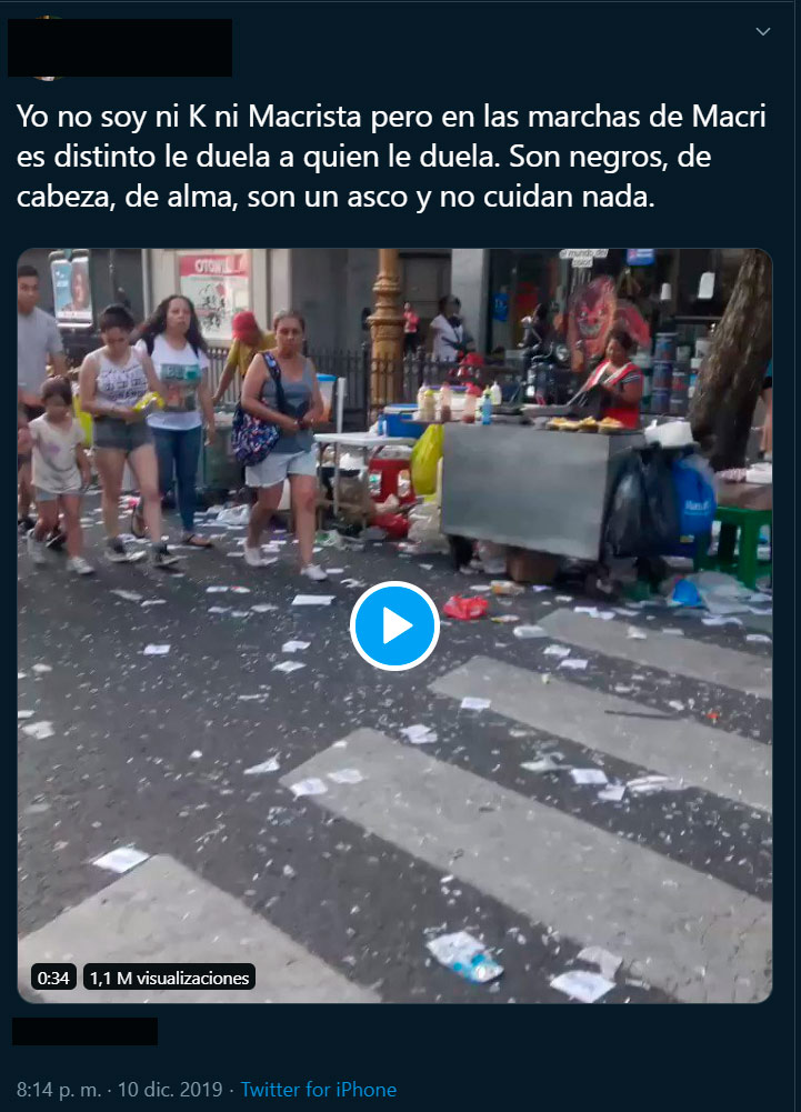 Esto se explica por tres factores fundamentales: el primero es que la utilización de “negros” para referirse a un otro, tanto por su condición de clase o por la adhesión política al peronismo, está socialmente habilitada para un conjunto de ciudadanos, en base a una distinción ad-hoc respecto del uso racista del término. Las formulaciones como “no digo negros de piel, digo negros de alma” pretenden desmarcarse del racismo y por lo tanto habilitar su uso, mientras que no hacen más que confirmar la profundidad de un racismo que se imprime no sólo en la piel sino en el alma de los sujetos-objetos del odio.