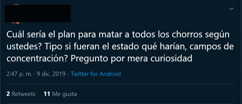 La estructura del odio utiliza además un mundo de elementos y prácticas que está vinculado a estos sujetos, y que en el caso de nuestro análisis no presenta variantes a pesar de ser convocado por diversos usuarios: chori, tetra, marcha, fuente. Junto con sentimientos y deseos que son expresados de manera explícita: asco, indignación, bronca, matar.