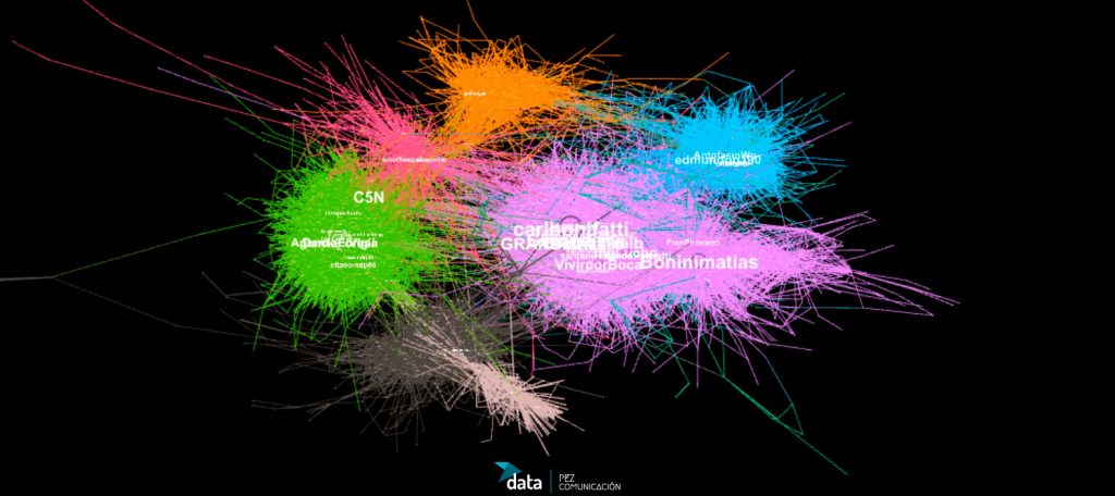 Twitter, como la mayoría de las redes sociales en la actualidad, organiza lo que vemos a través de un algoritmo que prioriza mostrarnos aquello con lo que estima vamos a mostrar mayor acuerdo, mayor consonancia cognitiva. Esto genera una dinámica de burbujas de usuarios que coinciden, que construyen un mundo común de sentido relativamente aislado de otros conjuntos de usuarios. La manera de estudiar esas organizaciones es vinculando a usuarios a través de los retweets, que definimos como el nivel de interacción que supone mayor nivel de concordancia ideológica entre dos usuarios. Esas burbujas en Twitter argentina están muy consolidadas, sus características son la polarización, la jerarquización interna y la intensidad. Cada conjunto de usuarios que pertenece a una burbuja, lee, interactúa y escribe para esos usuarios.