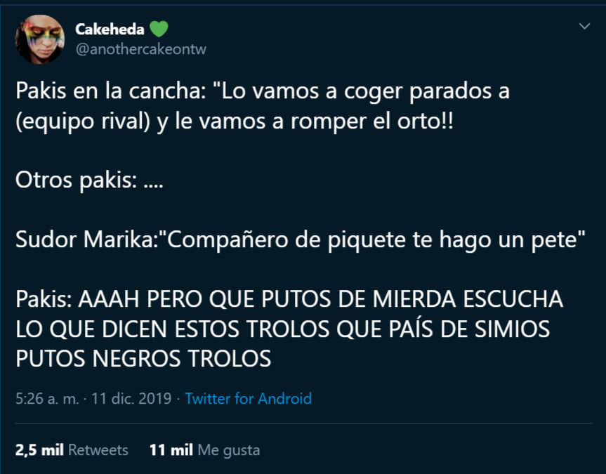 Estos dos elementos permiten señalar que el discurso de odio aparece muy fuertemente en usuarios reales más que en usuarios trolls y bots, que si bien juegan roles centrales en la creación de tendencias y en la definición de líneas discursivas a seguir, no utilizan fórmulas de discurso de odio que puedan ser rápidamente detectadas por Twitter, evitando así exponerse a la suspensión de la cuenta. En este caso, los trolls funcionan como activadores de una conversación que ya se sabe ahí, la discriminatoria, la del odio explícito, que es finalmente ejecutada por usuarios reales.