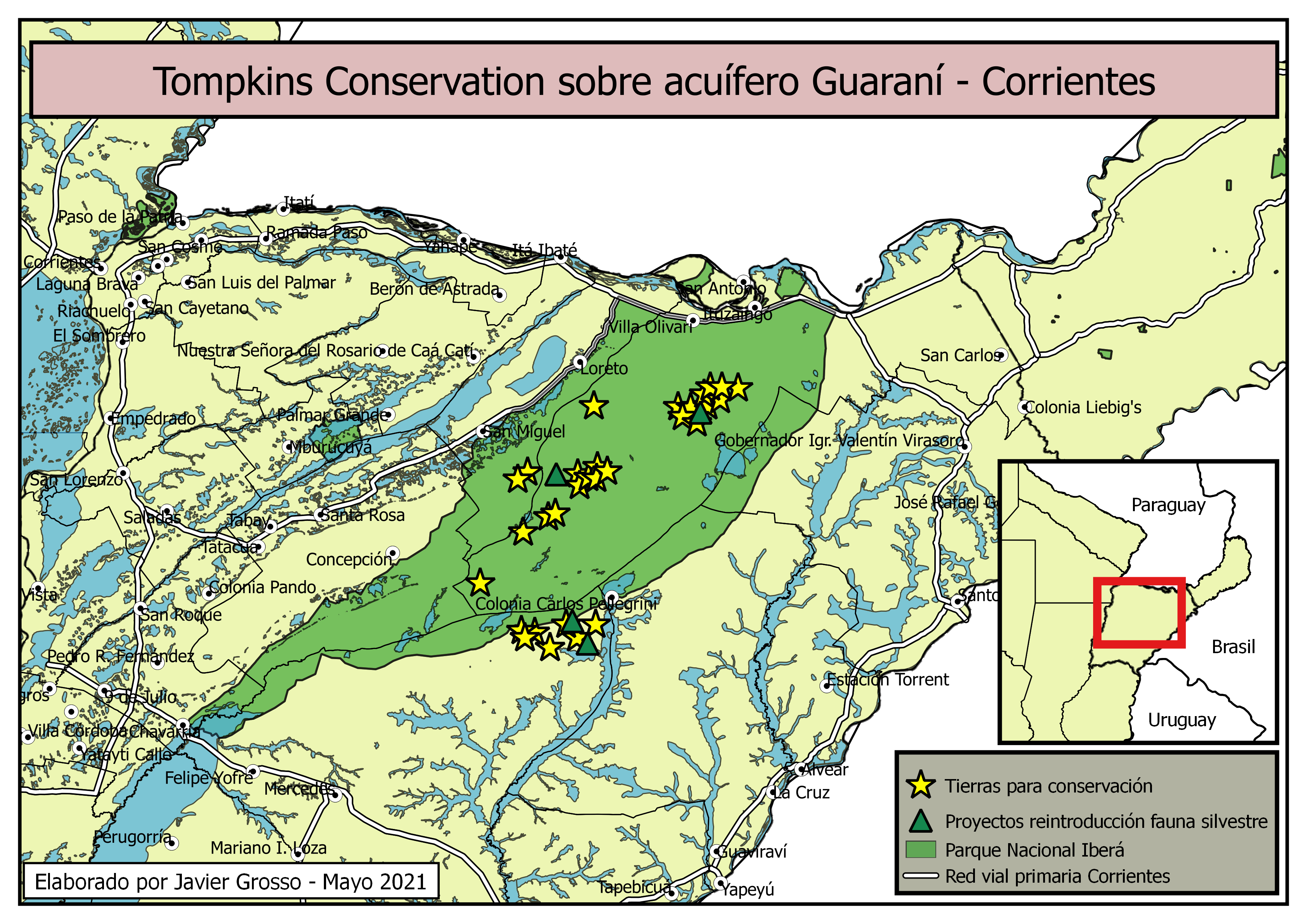 La formación del humedal del Iberá comprende más del 14% de la superficie total de la provincia de Corrientes. Las aguas de sus esteros, bañados y pantanos son la expresión superficial del acuífero Guaraní, la tercera reserva mundial de agua dulce. Allí TC acaparó al menos 200.000 hectáreas, de acuerdo a documentación del Registro Nacional de Tierras Rurales que puede estar desactualizada. Según la propia TC donaron más de 150.000 con distinto nivel de conservación.