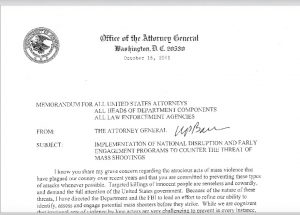 El 16 de octubre, el Procurador General designado por el Presidente Donald Trump, William Barr, quien ya había ocupado el mismo cargo con el presidente George W. Bush, envió una nota a todos los fiscales y a todos los organismos de seguridad del país, sobre la "Implementación de un Programa Nacional de Combate y Acción Temprana contra la Amenaza de Tiroteos Masivos". La nota anuncia una capacitación a realizarse en diciembre en la sede central del FBI, a la cual se solicita que cada corresponsal envíe a los mejores y más brillantes funcionarios, ya que la secretaría de Justicia, el FBI y los "socios del sector privado" los instruirán sobre la nueva política a instrumentarse, que según Barr derivará de las aplicadas "contra la amenaza terrorista". Es decir, una vez más, replicar dentro del país lo que se ha practicado fuera. El objetivo es "refinar nuestra capacidad de identificar, evaluar y actuar sobre los posibles tiradores masivos antes de que ataquen”, mediante "una estrategia eficiente, efectiva y programática para interferir a las personas que se están movilizando hacia la violencia, por todos los medios legales".