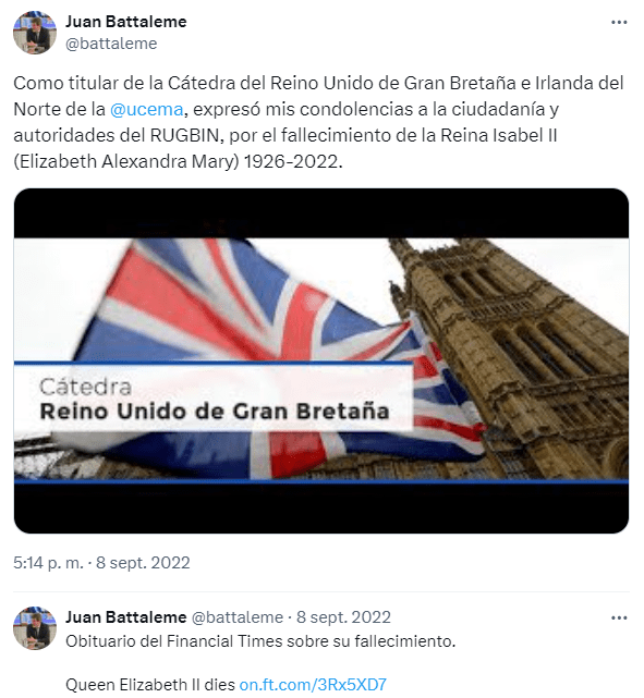 El coronel ahora retirado tuvo claro que no habría espacio para sus preocupaciones profesionales cuando en el Ministerio de Defensa designaron a Juan Erardo Battaleme Martínez, titular de la Cátedra del Reino Unido de Gran Bretaña e Irlanda del Norte de la Universidad del CEMA y docente de Ciencia Política de la UBA. Superado el duelo por el fallecimiento de Elizabeth Alexandra Mary, el funcionario asumió la Secretaría internacional del Ministerio, en donde se ocupa de los asuntos anglo-norteamericanos de la cartera. Desde allí, se resiste estoicamente a hablar de enclave colonial (como sostiene la DPDN 2021) o de una base militar británica en el Atlántico Sur, y prefiere el eufemismo “situación territorial irresuelta”, a la vez que considera necesario recrear el camino de la seducción con Londres. Por supuesto, a contramano de la DPDN 2021, Battaleme considera —apoyándose en el ex banquero Felipe de la Balze— que “no hay margen para realizar acciones que comprometan la seguridad hemisférica ni tampoco espacio para incorporar capacidades militares o realizar acciones que sean percibidas como desafíos a las pautas del orden de seguridad hemisféricas establecidas por Estados Unidos”.