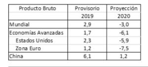 Las consecuencias económicas del Covid-19 son muy duras para China, sumadas a la caída del intercambio comercial previo con Estados Unidos. El FMI proyecta la caída de la tasa de crecimiento del Producto Bruto por coronavirus: