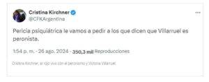 Cristina envió a sus senadoras más próximas a cuestionar esa jugada. La ex Presidenta dijo que la responsabilidad institucional del peronismo desecha tal peripecia y sugirió realizarle el peritaje psiquiátrico a quienes dicen que Villarruel es peronista.