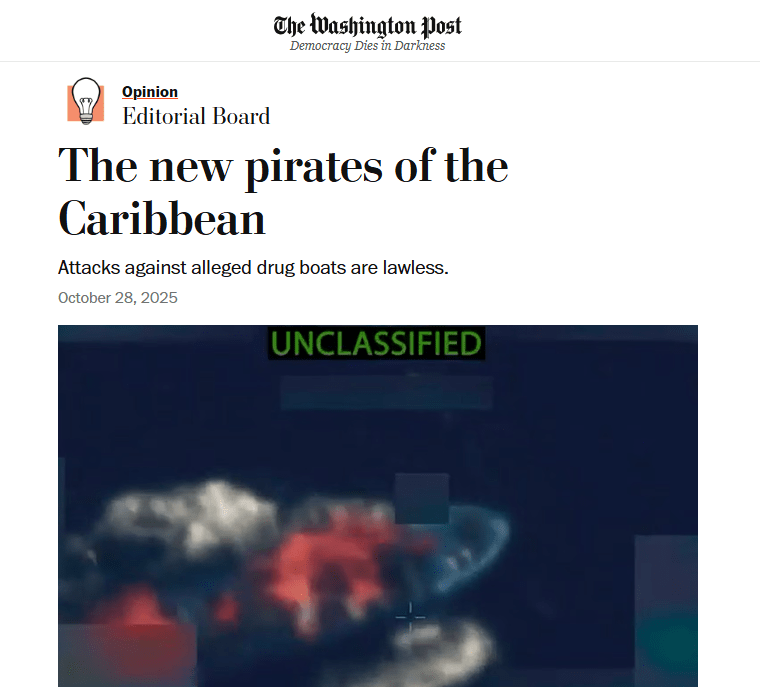 La guerra comenzada por Estados Unidos en el Caribe es ilegal, afirma The New York Times. Añade que las personas muertas podrían haber sido detenidas fácilmente y no asesinadas sumariamente. Los cuerpos no han sido recuperados, solo queda flotando la acusación de tráfico de drogas a las barcas atacadas.