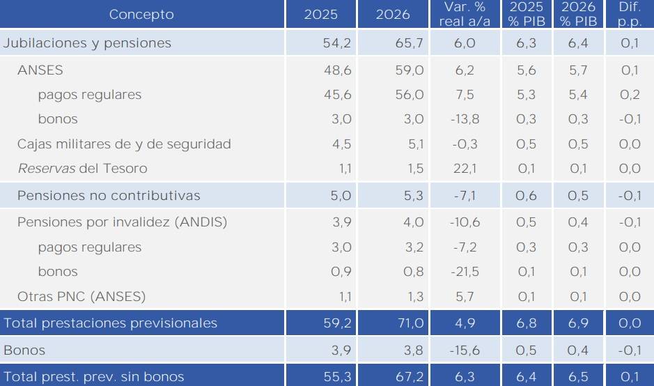 El cálculo general agrupa a las disímiles cuantías previsionales. Sin embargo, de acuerdo a los propios números del proyecto oficial, los haberes mínimos retrocederían el año próximo un 0,6% en relación a 2025, por el congelamiento en 70.000 pesos de los bonos que mitigan el despojo.