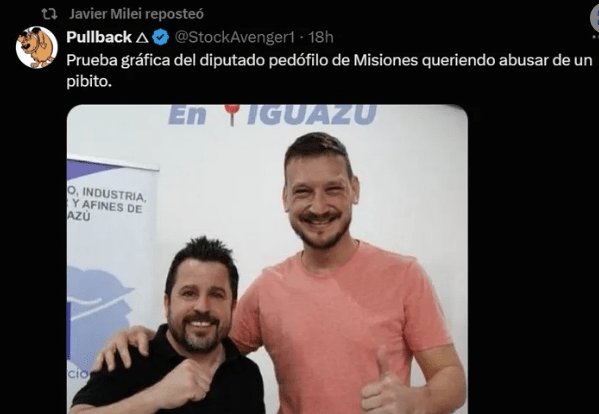 Desde la Casa Rosada se rieron de todo cuando el titular del Poder Ejecutivo Nacional reprodujo la foto del prófugo junto a un diputado afín, con el epígrafe: “Prueba gráfica del diputado pedófilo de Misiones queriendo abusar de un pibito”, lo que disparó la respuesta de sus aliados de la UCR: “@JMilei toma con liviandad un delito aberrante. Quizás debería hacer una capacitación sobre abuso infantil. Martín Tetaz puede defenderse, los niños que son abusados no”.