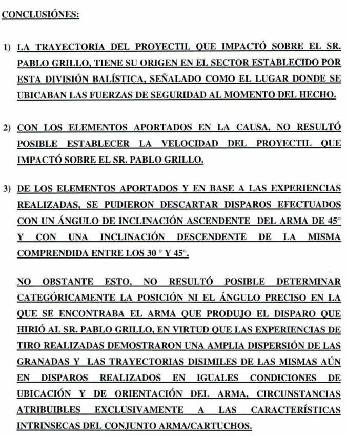 Los puntos esenciales del informe policial fueron los siguientes: en primer lugar, descartó que el disparo del gendarme Héctor Guerrero haya sido “en 45 grados hacia arriba o entre los 30 y 45 grados hacia abajo”, como obliga el manual de las pistolas lanzagases redactado por Gendarmería. Y, a continuación, determinó que si el gendarme hubiese disparado en cualquiera de esas dos formas, el cartucho de gas lacrimógeno jamás habría alcanzado a Pablo Grillo del modo en que trágicamente lo hizo. Por último, pese a que no pudo determinar “categóricamente” la posición ni el ángulo preciso en el que se encontraba el arma, como tampoco la distancia exacta del disparo, se estableció que el mismo provino desde la zona en la que estaba el gendarme, “donde se ubicaban las fuerzas de seguridad al momento del hecho”.
