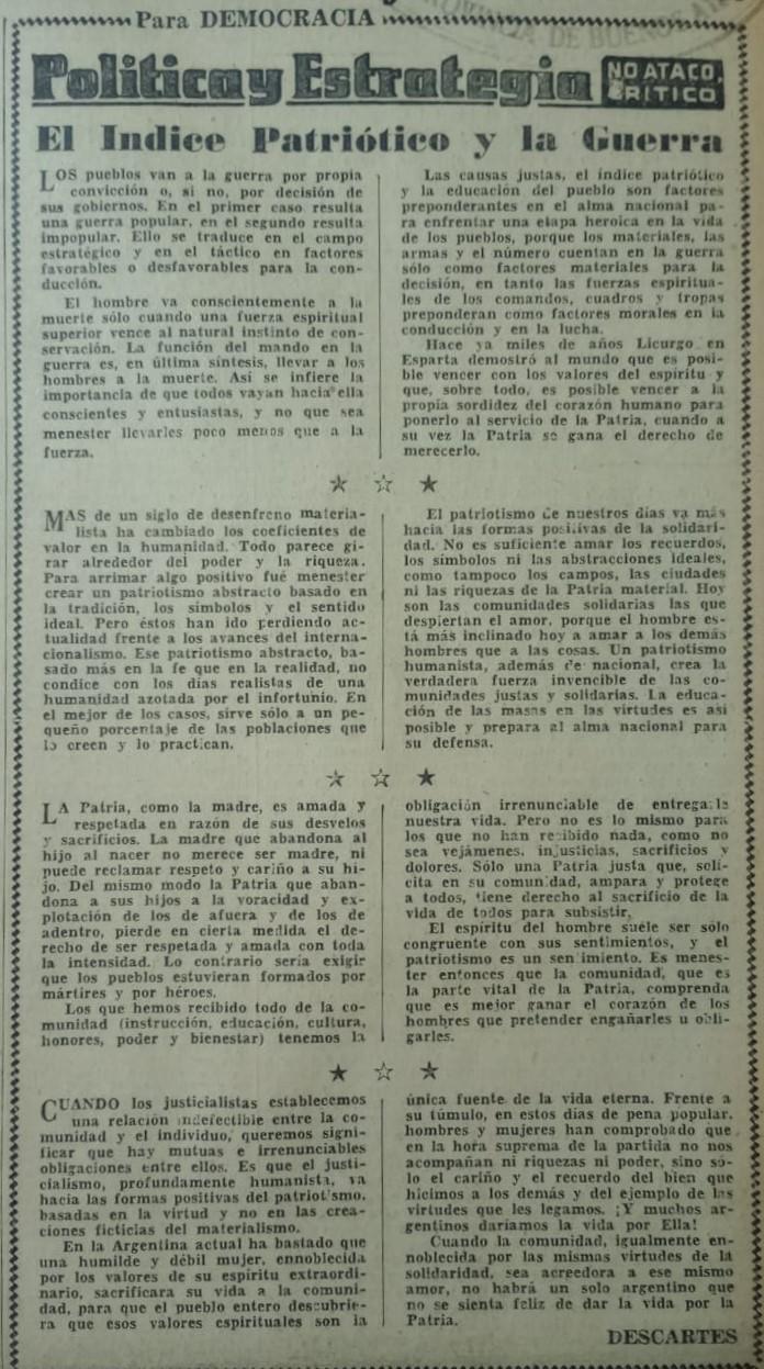 Vale ahora recuperar una columna publicada el 14 de agosto de 1952 que de algún modo unía tres componentes insustituibles para la consecución del gran objetivo cartesiano: el patriotismo, Evita y la configuración de una “mística política” que impulsara a los lectores hacia su conquista. La referencia alude a uno de los últimos artículos publicados bajo la rúbrica de Descartes, el seudónimo del Perón periodista.