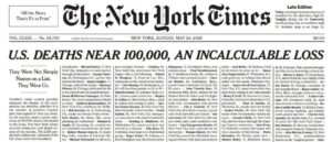 El domingo 24 de mayo, el New York Times publicó una portada que formará parte de la historia del periodismo. Su motivo era el estado de la pandemia en los Estados Unidos pero su mensaje fue universal. Simone Landon, editora del departamento gráfico, se propuso representar el número de muertes ya cercano a los 100.000 y dijo entonces que el número en una página “en realidad no dice mucho acerca de quiénes eran esas personas, de las vidas que vivieron, de lo que todo esto significa para nosotros como país”. Por eso tuvo la idea de compilar obituarios y esquelas de víctimas de Covid-19 publicados en diversos periódicos del país para seleccionar algún fragmento vívido de cada persona.