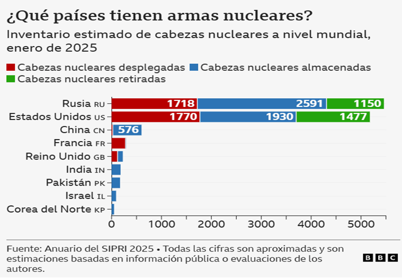 De acuerdo a la BBC, y en base a los datos del Instituto Internacional de Investigación para la Paz de Estocolmo (SIPRI), la distribución de dichas ojivas es la siguiente: