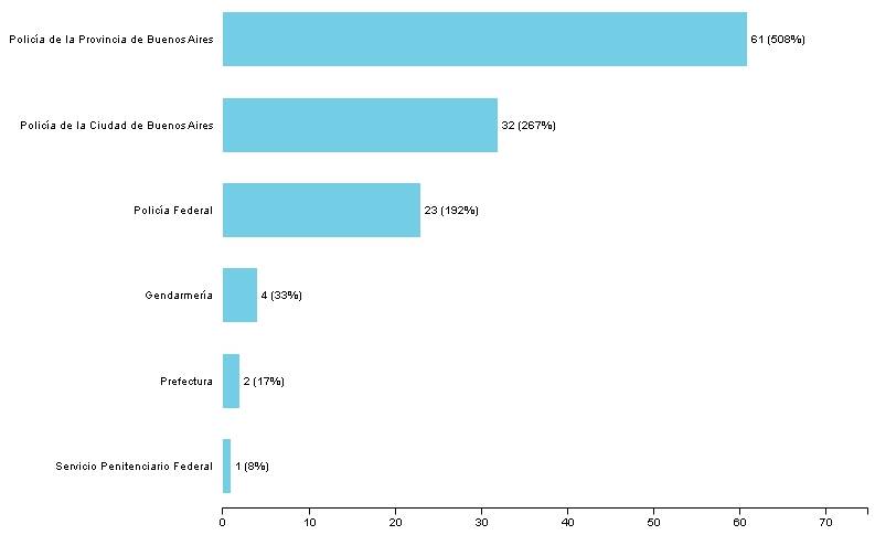 La Policía bonaerense concentra la mitad de los hechos letales. Una cuarta parte es atribuible a la Policía de la Ciudad Autónoma y la otra cuarta parte, a las fuerzas federales (Policía Federal, Gendarmería, Prefectura, Policía de Seguridad Aeroportuaria y Servicio Penitenciario).
