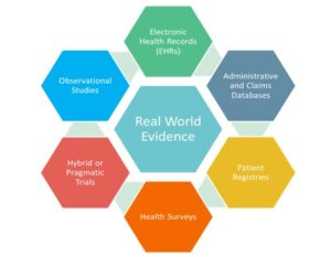 Real World Data son datos digitalizados de diversas fuentes (historias clínicas electrónicas, wearables, imágenes, etc); Real World Evidence es lo mismo pero pulido, estandarizado y procesado, listo para ser analizado y utilizado en ensayos clínicos/modelos predictivos. Además, estos datos son de mucha mejor calidad porque son datos de una población real (en contraposición a los datos estériles y controlados provenientes de un ensayo clínico).