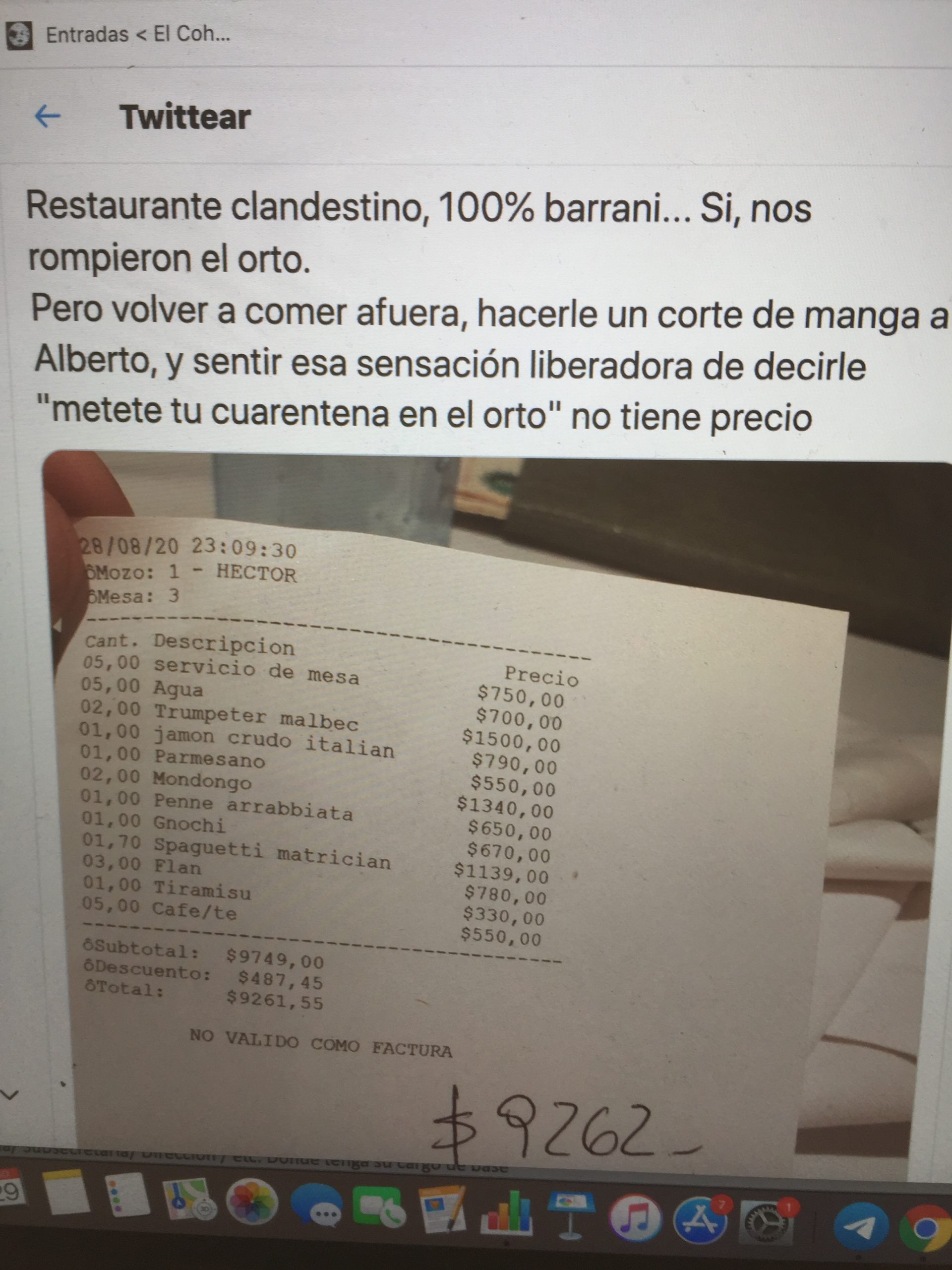 Con la experiencia, se concluye que sólo hay cuatro tipos de votantes. Los que votan para que las mayorías estén mejor. Los que votan para estar bien ellos. Los que, creyendo votar para estar bien ellos, votan en contra de sus propios intereses. Y los que, aun sabiendo que votan en contra de sus intereses, votan por odio. Ayer hizo roncha el Tweet de un pelmazo que fue a a un restaurant clandestino, donde le cobraron casi $ 10.000 por comer mondongo y fideos. "Nos rompieron el orto", puso, pero se manifestaba feliz porque le había hecho un corte de manga a Alberto que expresaba de este modo, un tanto obsesivo en materia temática (debe ser proctólogo, o estar enamorado de uno): "(Alberto) metete tu cuarentena en el orto".