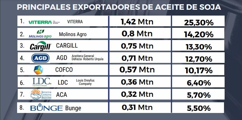 Y luego están las ocho principales sociedades que exportan aceite y harina de soja. Hay jugadores que se repiten en los diferentes eslabones.