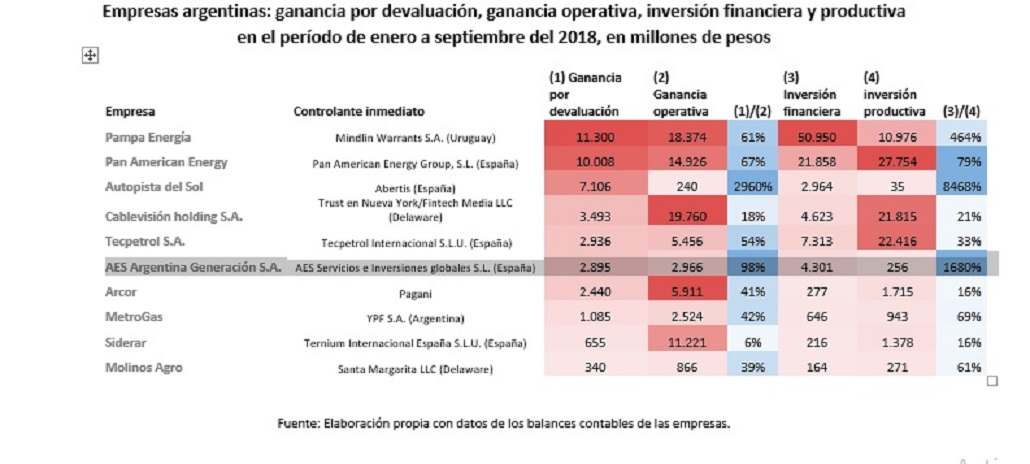 Diez empresas de la cúpula empresaria argentina ganaron $ 42.000 millones con la devaluación entre enero y septiembre del 2018, mientras sus ganancias provenientes de la actividad principal sumaron $ 82.000 millones. Es decir, las ganancias logradas sin esfuerzo alguno equivalen al 51% respecto a aquellas realizadas por la puesta en marcha de la actividad productiva. Esto se debe a que dichas empresas invirtieron en activos financieros, muchas veces dolarizados, por unos $ 93.000 millones, mientras la inversión productiva fue de $ 87.000 millones en igual período. En lo que va del año, las inversiones financieras de las mismas fueron más grandes que las inversiones productivas.