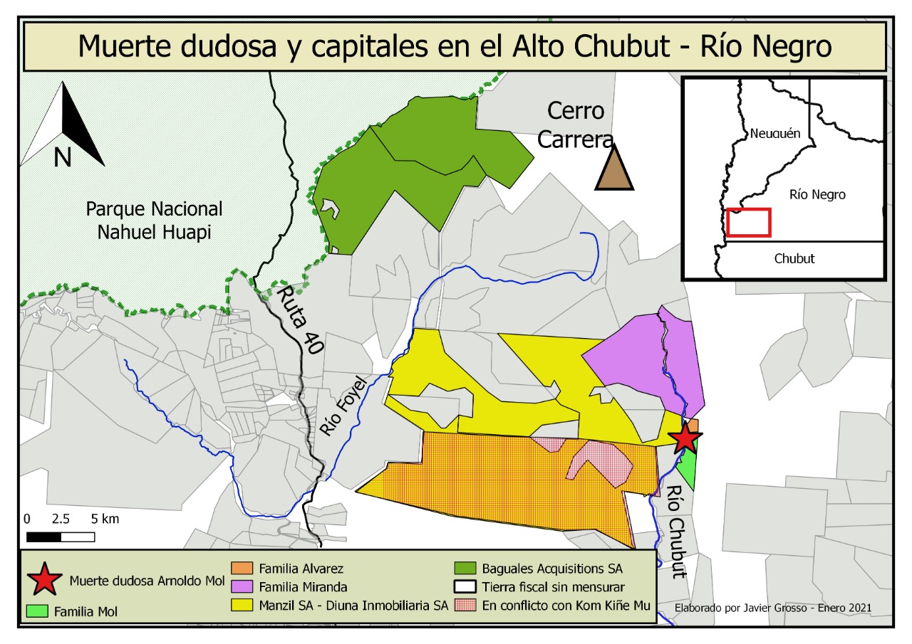 Las tierras fiscales de Mol, Miranda y Alvarez junto al río Alto Chubut son parte del espacio territorial que desde la década del ’90 la inmobiliaria de Bariloche creada por Federico van Ditmar pretende obtener para sus clientes de capitales transnacionales, con la participación activa de los sucesivos gobiernos provincial y del aparato de Estado, como se probó en numerosos casos que la justicia ordinaria de Viedma dejó impunes (2017, fallo en el caso “Accatino, Juan Manuel, Tait Daniel Alberto y Belacín, Jorge Daniel sobre fraude en perjuicio de la administración pública”). El coto de caza mayor iniciado por Marcos Marcelo Mindlin vulneró también derechos de Miranda a tierras de veranada, lo que constató la Comisión Investigadora de Tierras Fiscales de la Legislatura de RN en 2013, muchos años antes que el zar criollo de la energía revendiera más de 14.000 hectáreas de Rincón del Diablo a las firmas del emir de Qatar.