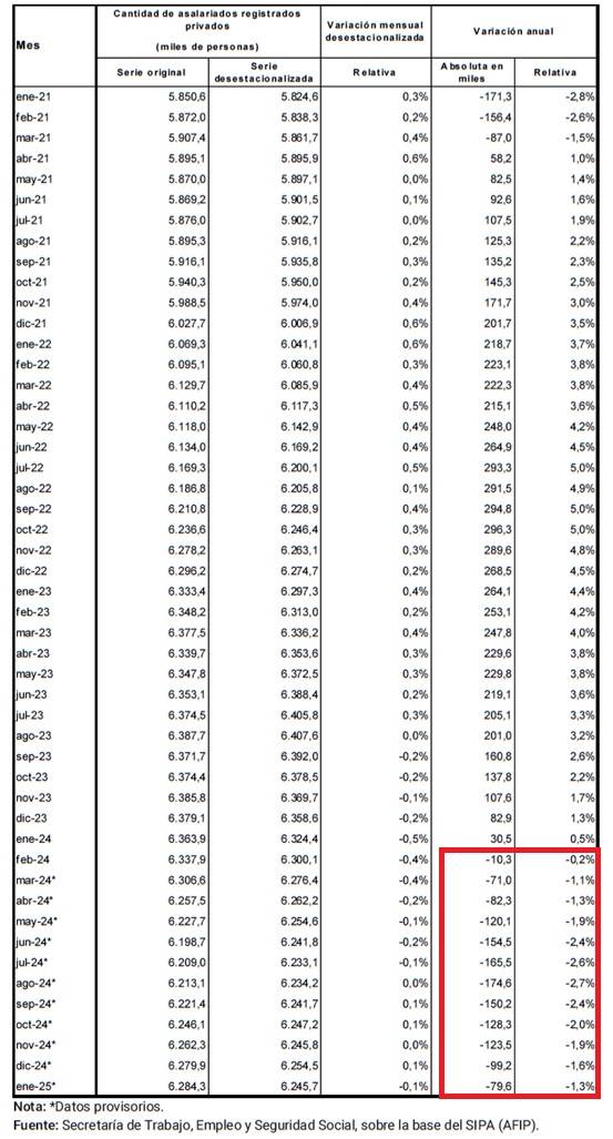 El informe sobre enero de este año, publicado este mes, repite esas tendencias. La contracción del empleo asalariado registrado en el sector privado cumplió su duodécimo mes consecutivo de caídas interanuales. Hasta que se interrumpió en febrero de 2024, se acumulaban 34 subas mensuales interanuales.