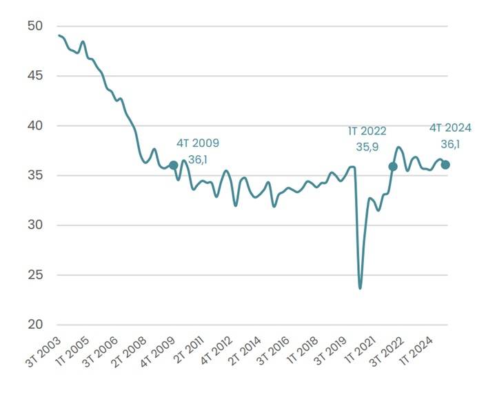 Medida como la porción de las personas ocupadas que desarrollan sus actividades al margen de las normas que las regulan, en el último trimestre de 2024 la tasa de informalidad total se ubicó en 42%. Ese número la coloca 0,6 puntos por debajo de la estimación anterior, pero otro tanto por encima del periodo final de 2023.