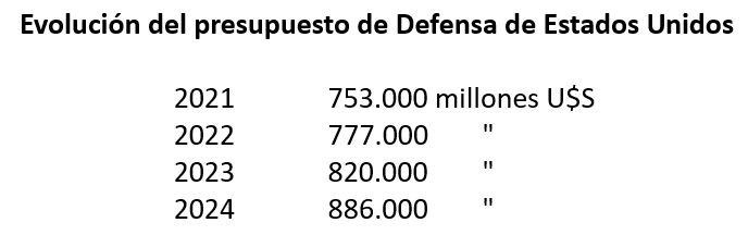 El presupuesto del Departamento de Defensa americano alcanza cifras siderales: se acerca a los 900.000 millones de dólares, tendencia en crecimiento en los últimos diez años. Uno de los motivos es la presencia de China como competidor, y el más reciente es la guerra en Ucrania.