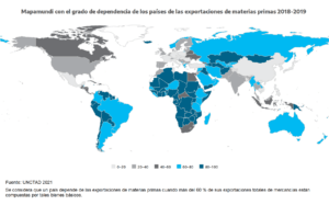 “El estado de la dependencia de materias primas 2021” (EDMP 21) (The state of commodity dependence 2021) es un informe que la UNCTAD publica cada dos años y sus datos sirven para cotejar la factibilidad del reembolso del endeudamiento externo, puesto que los dólares para pagar (frente a la alternativa de seguir bicicleteando) salen del saldo positivo de las exportaciones menos las importaciones. La UNCTAD define que un país depende de la exportación de materias primas cuando estas explican más del 60 % del total de sus exportaciones.