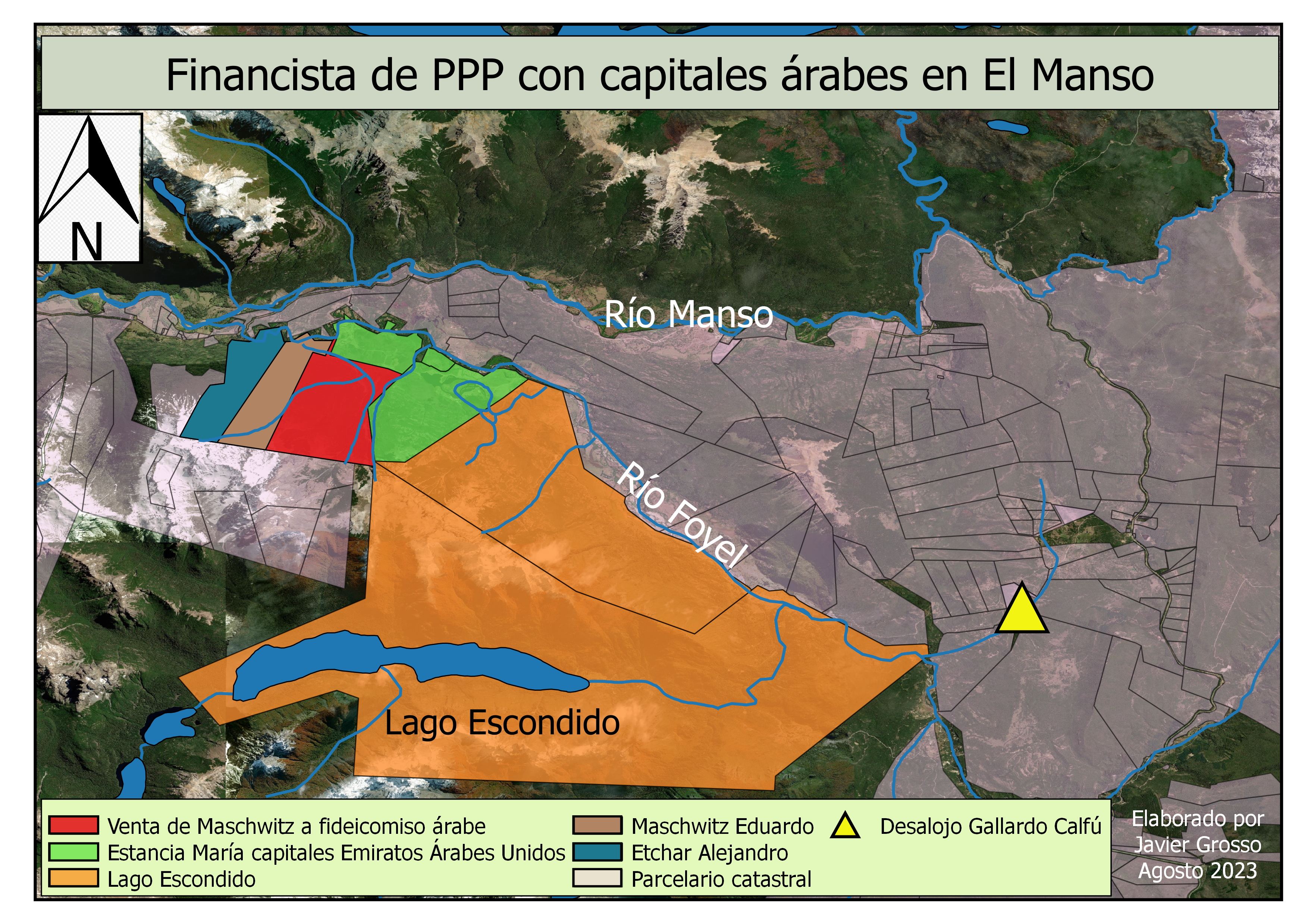 Distintos organismos públicos rionegrinos dieron nueva forma documental al acaparamiento de casi 1.000 hectáreas ubicadas sobre la costa sur del río Foyel, en el paraje El Manso. Esas tierras son parte del bloque que adquirió Alyabhouni Aldhaheri a partir de 2017. En esta nueva documentación, Maschwitz aparece como copropietario de una fracción de 956 hectáreas junto a Ignacio Petrocchi Massuh, uno de los argentinos que canaliza algunos de esos capitales de Oriente Medio en la zona. Estas inversiones están a pocos kilómetros del territorio tradicional mapuche de la Lof Gallardo-Calfu, en cuyo desalojo intervino desde las sombras, según consta en documentación empresaria interna a la que accedimos en su momento.