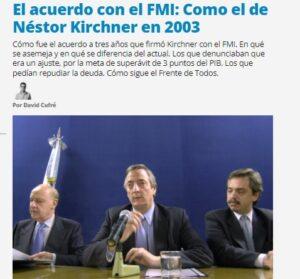El viernes 28 de enero la Argentina pagó 721,5 millones de dólares al Fondo Monetario Internacional, a los que hay que adicionar otros 368,4 millones de intereses que se oblaron el martes 1° de febrero. Al día siguiente del primer pago, el diario del multimedios Octubre, que conduce Víctor Santa María, publicó una nota según la cual el actual Presidente aprovechó la experiencia de Néstor Kirchner en 2003 para buscar la solución a la deuda que le dejó Maurizio Macrì.