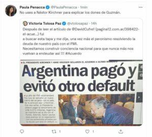 La diputada Victoria Tolosa Paz publicó una tapa de Clarín de aquel momento. De inmediato la diputada camporista Paula Penacca le respondió que no usara a Néstor Kirchner.