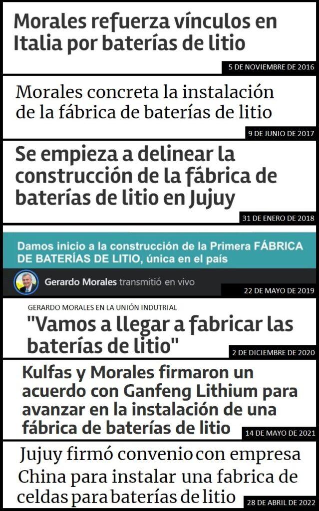 Abril de 2022. El gobernador de Jujuy, Gerardo Morales, batió el récord de anuncios grandilocuentes sin resultados, al festejar la firma de otro convenio para “instalar una fábrica de baterías de Litio”, esta vez con una empresa china, sin ninguna precisión sobre plazos e inversiones ni especificaciones técnicas, económicas o financieras de ningún tipo. Mientras tanto, la empresa Sales de Jujuy S.A. (de Orocobre y Toyota Tsusho), continúa extrayendo salmueras del salar de Olaroz y exportando unas 12.000 toneladas anuales de carbonato de litio que luego refina y transforma en el exterior, dejando a cambio regalías provinciales por debajo del 2% de las ventas declaradas.