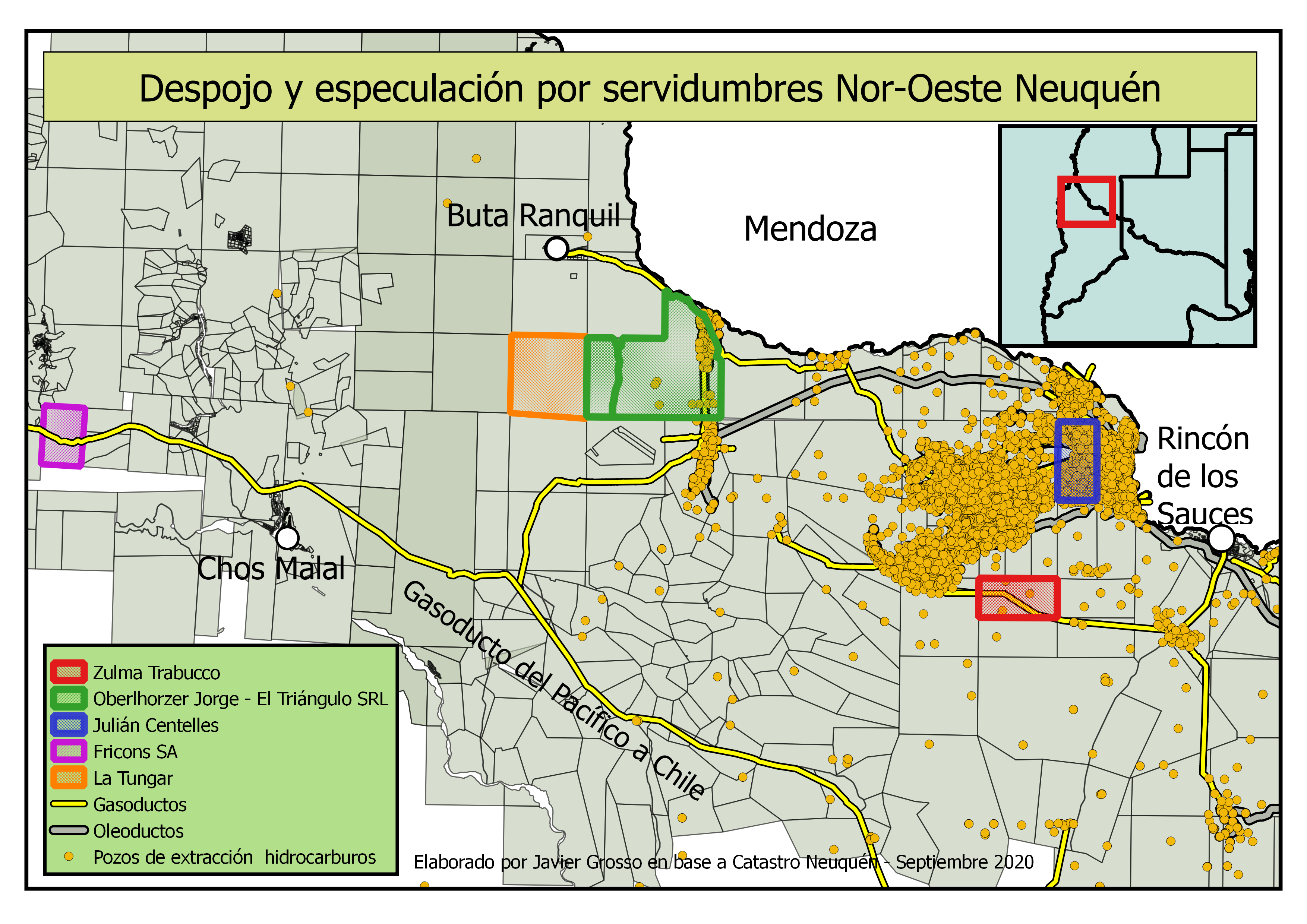 La administración de Macri confirmó lo acertado de las apropiaciones de tierras en el departamento Pehuenches al norte surcadas por oleoductos, gasoductos y pozos activos. La misma mirada estratégica tuvo Luis María Pessino, el comerciante y ganadero de Chos Malal que con Fricons SA se apropió de tierras junto a la frontera con Chile. La resolución conjunta de la Secretaria de Agricultura Ganadería y Pesca, y la Secretaria de Recursos No Renovables y Mercado de los Combustibles, en abril de 2019 tomó la solicitud de la Asociación Argentina de Propietarios y Superficiarios Afectados por la Explotación Hidrocarburífera, Minera y Eléctrica (AASEP) y actualizó las indemnizaciones percibidas por superficiarios. En el caso de la zona “A” de tierras de secano, se aumentó en un 146,02% este pago en carácter de indemnización; establece indemnizaciones en concepto de lucro cesante y daños emergentes, relacionados con: